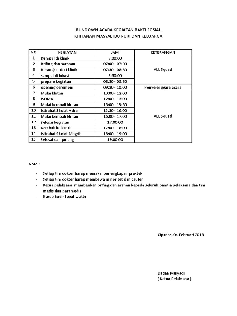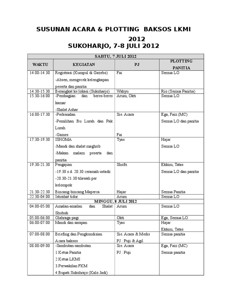 SUSUNAN ACARA BAKTI SOSIAL DI PANTI ASUHAN AL-HAKIEM. Contoh Rundown Acara Bagi Anda yang suka berorganisasi atau menjadi panitian kegiatan apapun tentu sudah tidak asing lagi dengan yang namanya rundownRundown acara dibuat dengan tujuan untuk menjelaskan jenis-jenis atau susunan kegiatan yang akan dilaksanakan sesuai dengan durasi waktu dari setiap kegiatan. Proposal Buka Puasa Bersama Anak Yatim Pdf Free Download.