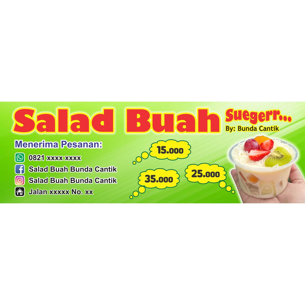 Luar Biasa X Banner Salad Buah Erlie Decor. Dari usaha ini diasumsikan dalam satu hari totalnya penerimaaan yang di dapat dari salad buah adalah sebanyak 100 porsi dengan harga rp 12. Spanduk Jual Es Kelapa Muda.