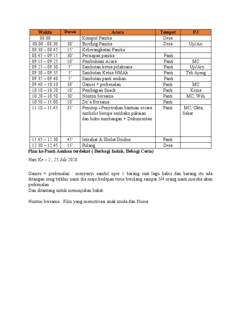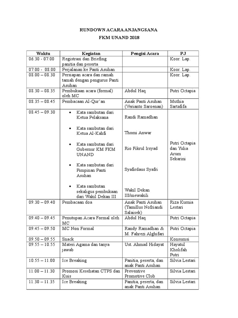 Rundown acara panti asuhan. 95 rows Contoh Rundown Acara untuk Bakti Sosial RUNDOWN ACARA. Semua sekolahan baik di jenjang sekolah dasar. Pada hari ini POLRES TANJUNG PRIOK mengadakan acara Doa bagi Bangsa bersama dengan anak-anak Panti Asuhan Pondok Kasih Agape.