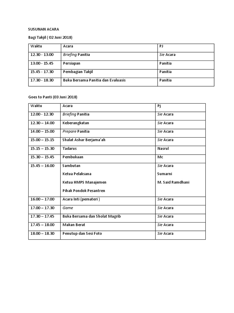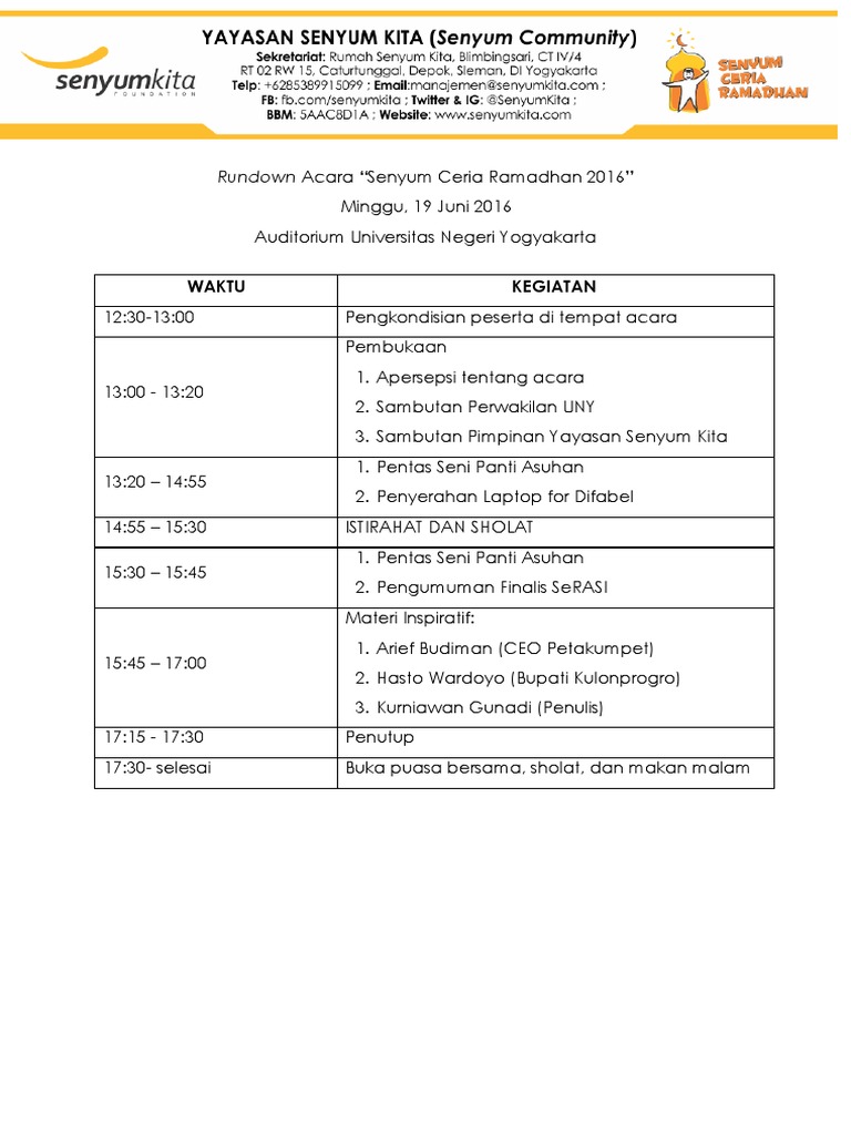 Cobalah buka bersama di panti asuhan bareng anak yatim piatu. Contoh Rundown Acara Ramadhan Modif P. Rundown acara natal sekolah minggu dan remaja hkbp sidoarjo 16 desember 2017 n o acara keterangan durasi pic time keeper 1 prosesi team perkusi.